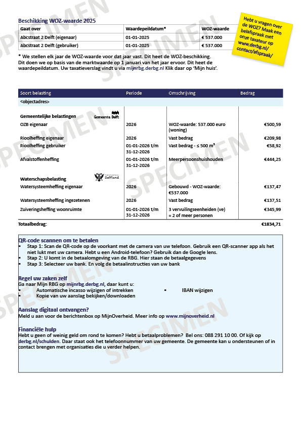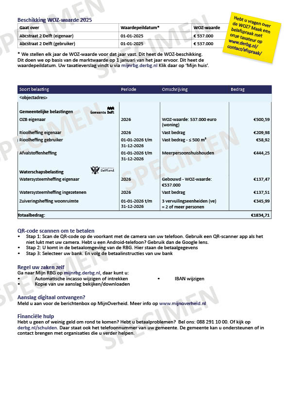 Op de belastingoverzichtpagina staat meer uitleg per belasting. Sommige belastingen zijn voor de eigenaar en de bewoner. Bijvoorbeeld de watersysteemheffing. Bent u eigenaar en woont u er ook? Dan krijgt u deze belasting twee keer (als eigenaar en als bewoner).