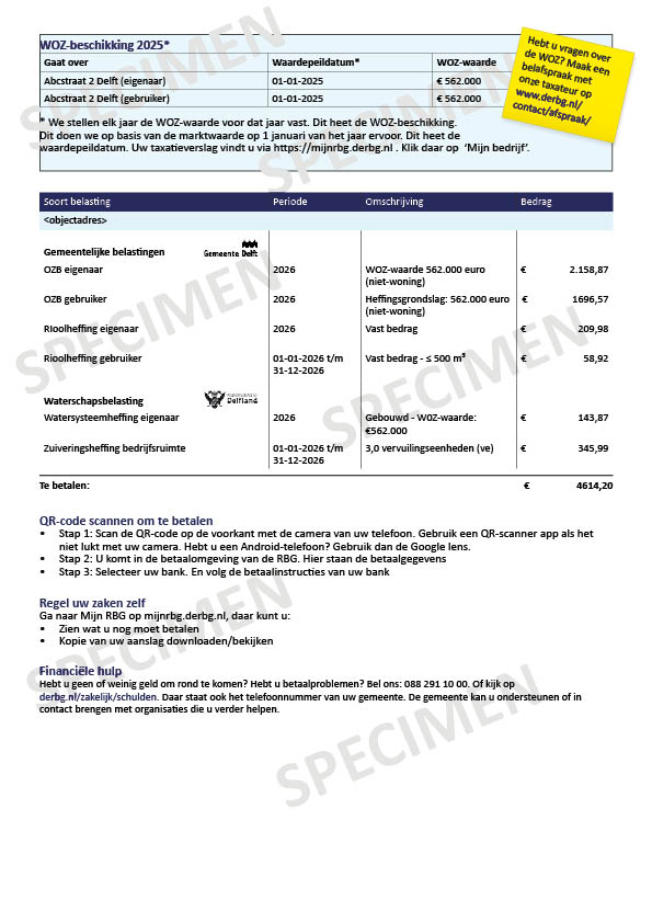 Op de belastingoverzichtpagina staat meer uitleg per belasting. Sommige belastingen zijn voor de eigenaar en de gebruiker. Bijvoorbeeld de onroerendezaakbelasting. Bent u eigenaar en gebruiker van het pand? Dan krijgt u deze belasting twee keer (als eigenaar en als gebruiker).